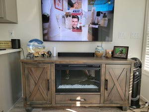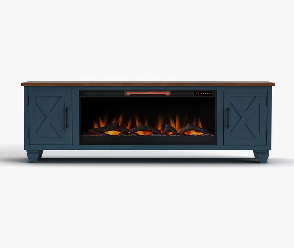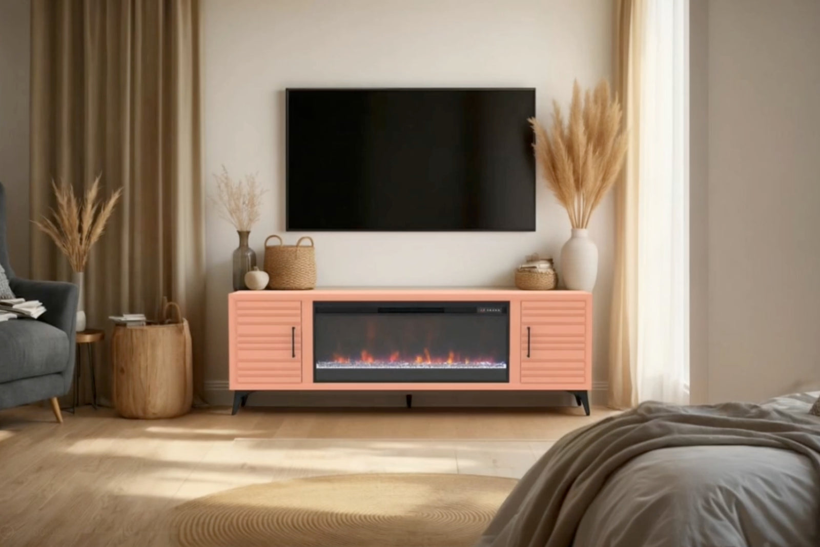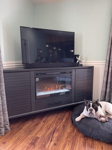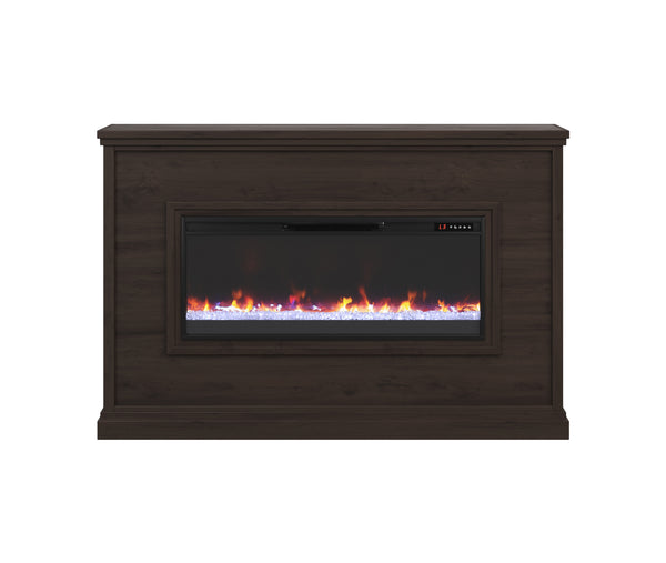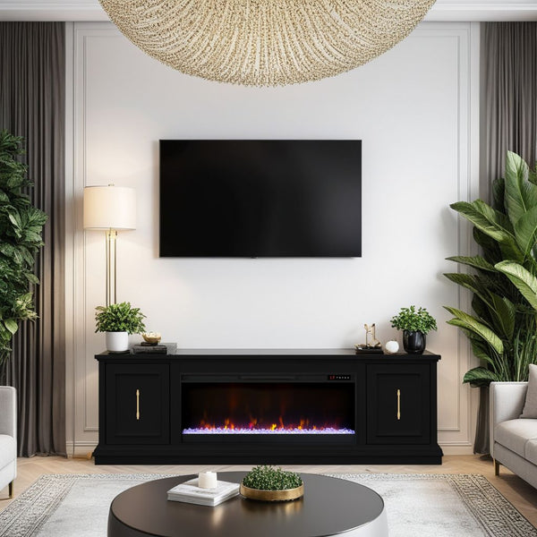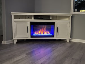 Customize your fireplace with wood logs or glass rocks, six flame colors, and adjustable brightness.