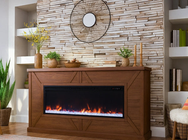 Multiple flame colors and brightness settings. Swap logs or fireglass.