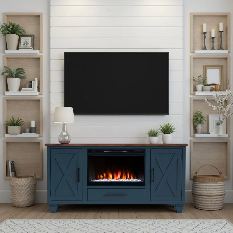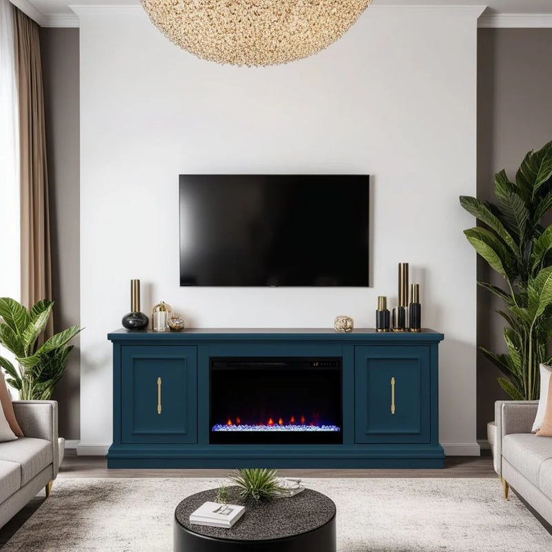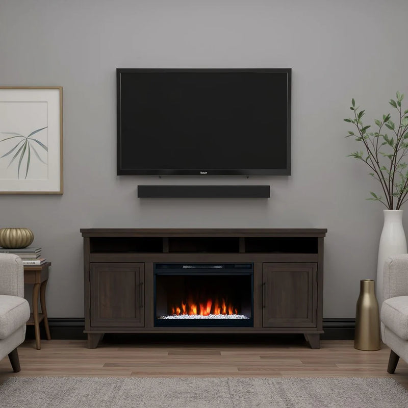 The fireplace glow makes the room feel instantly festive — even before the tree goes up.