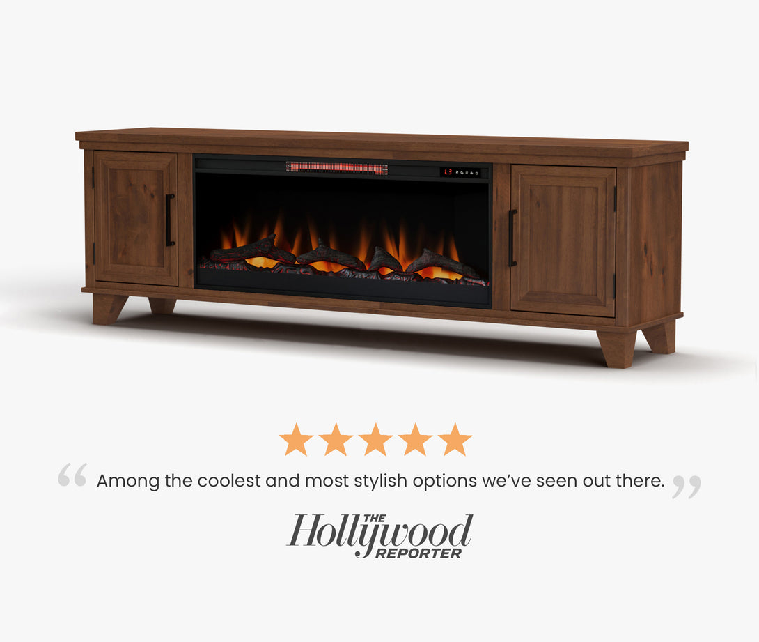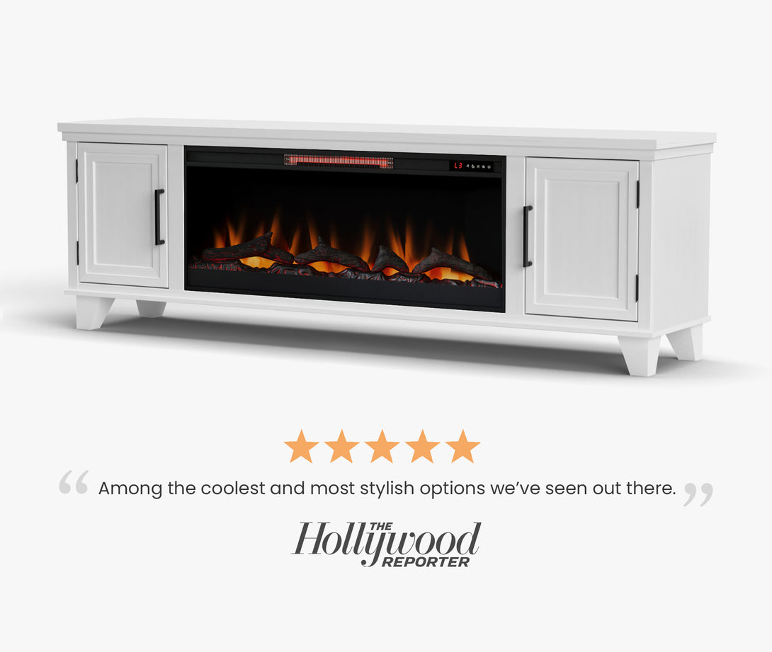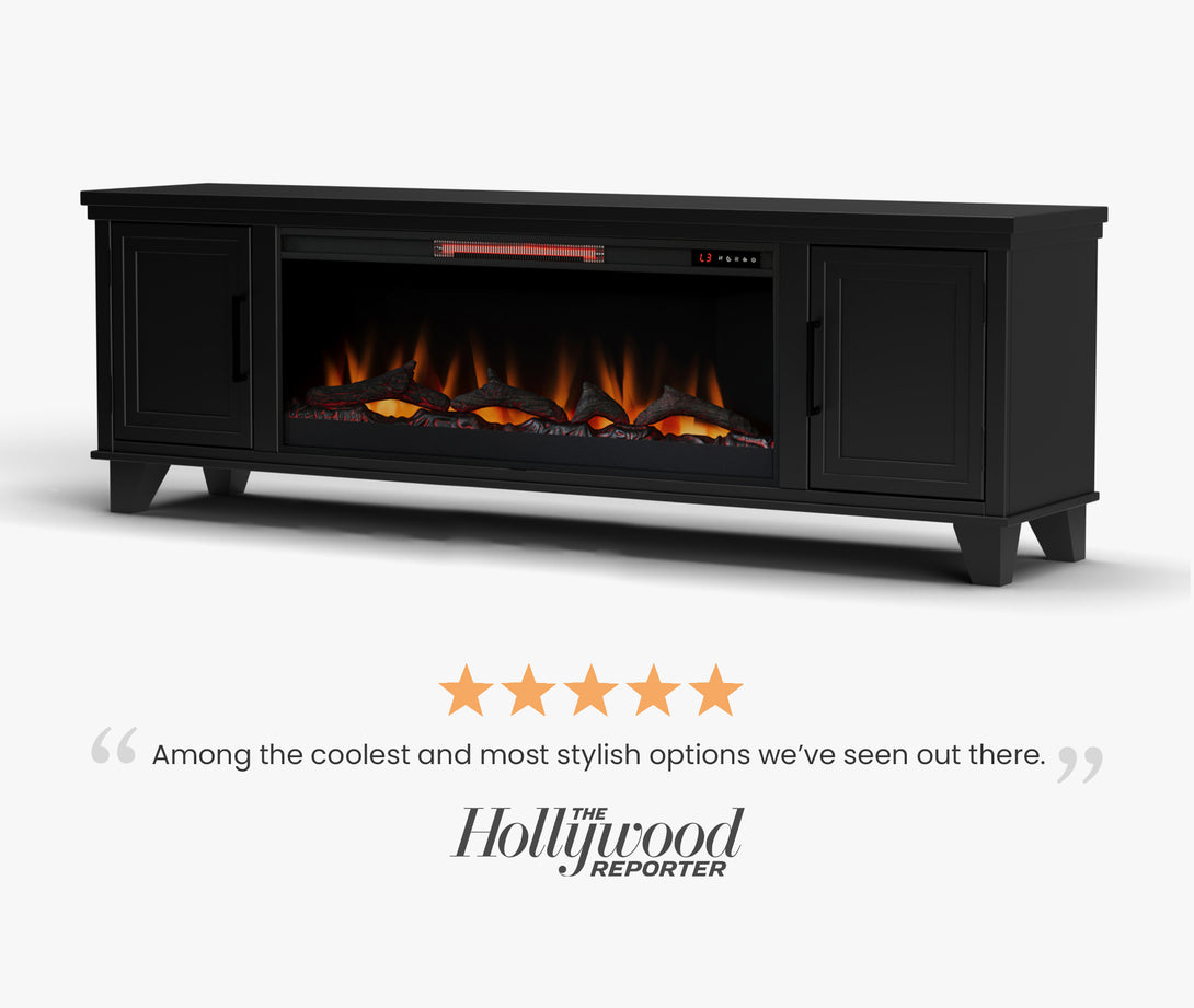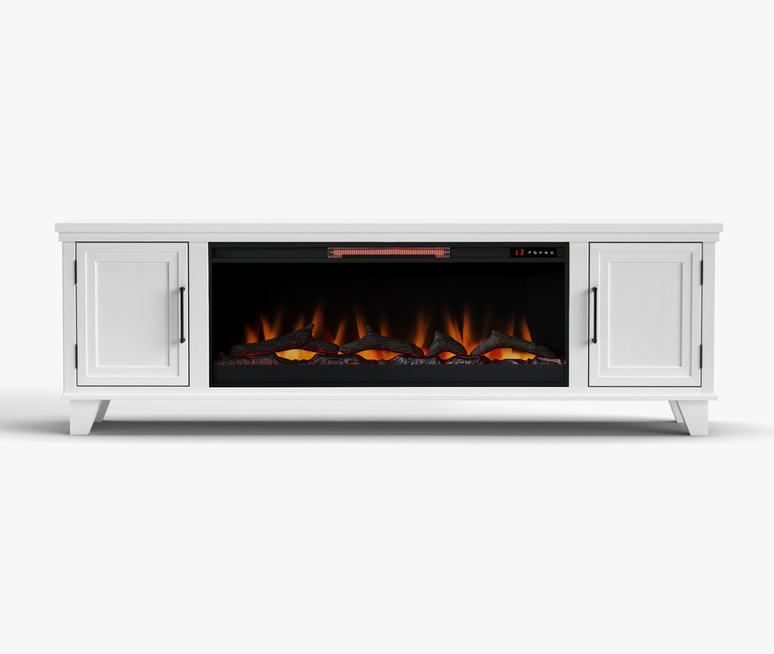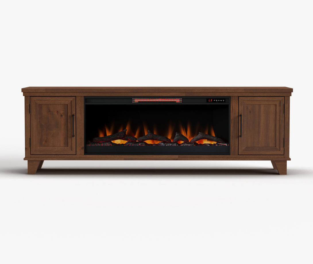 An electric fireplace add-on is available. Heating can be turned on to heat rooms up to 500 sq ft. Comes with customizable flame settings and variable speeds.