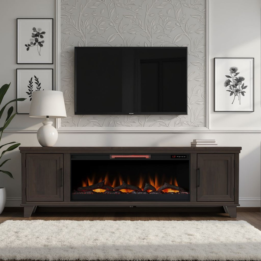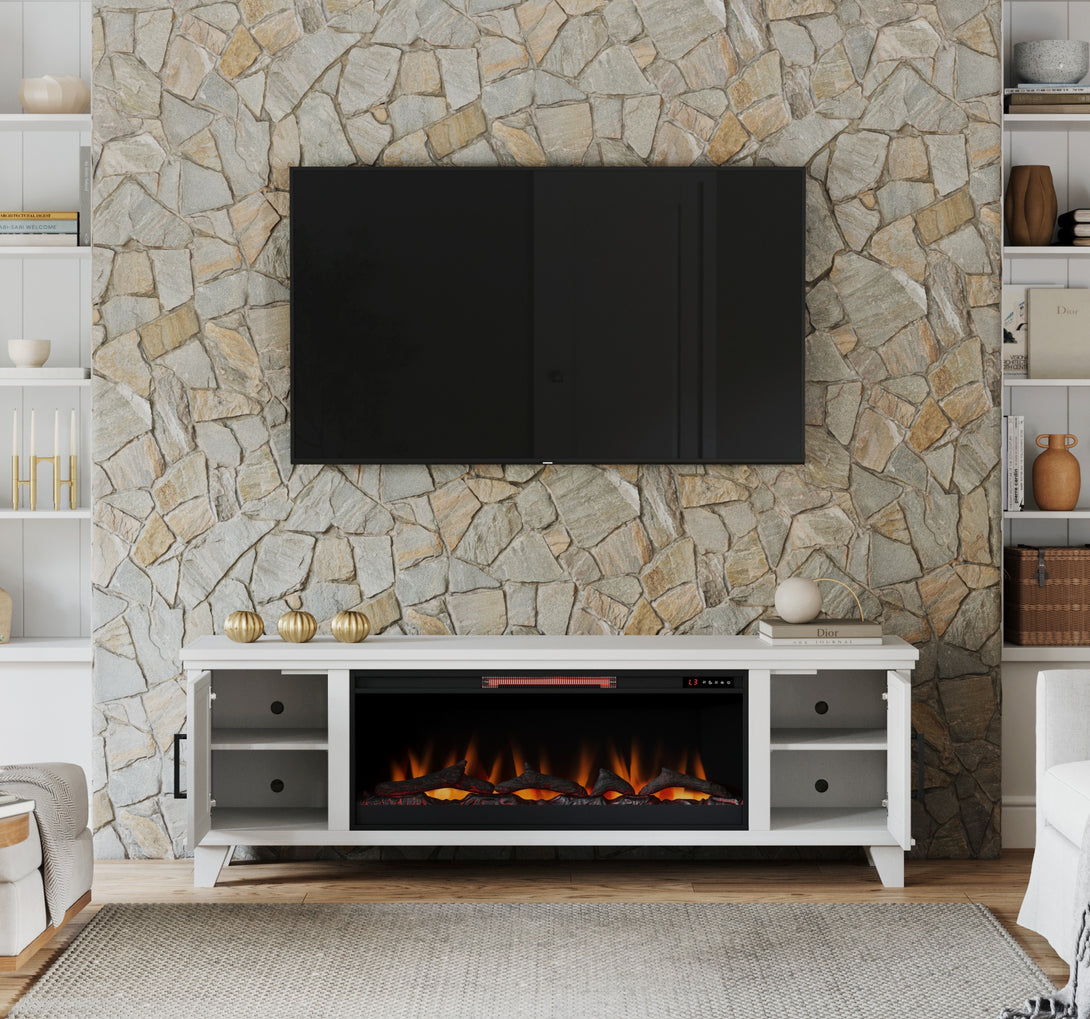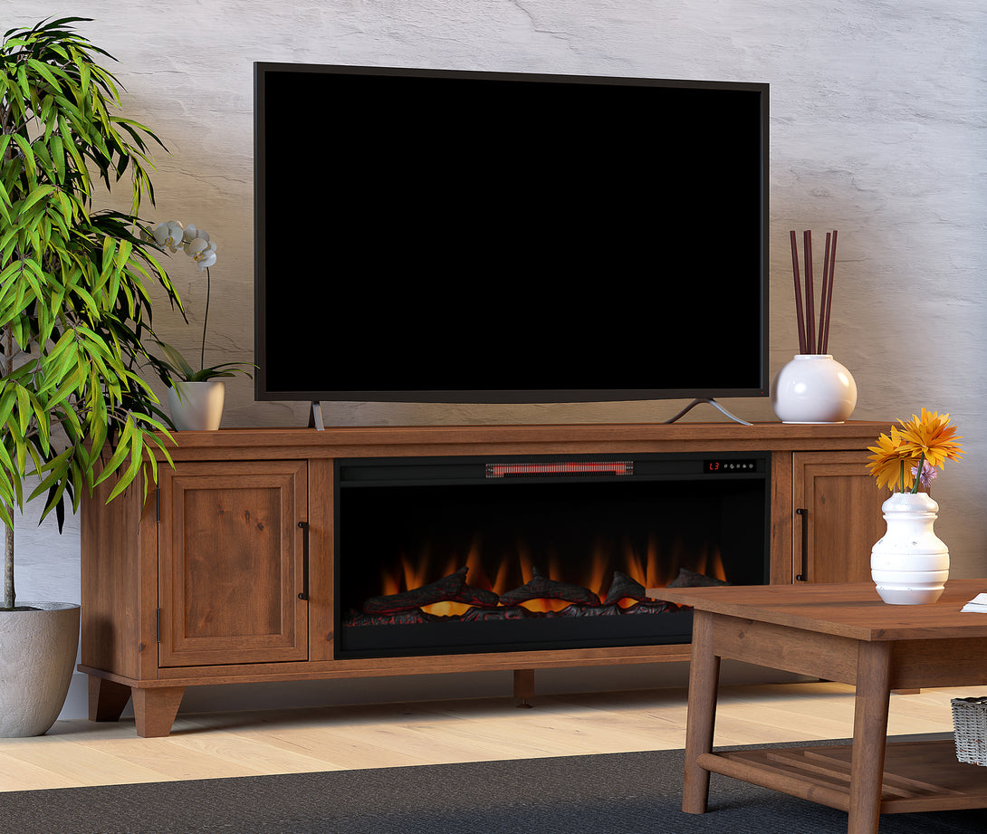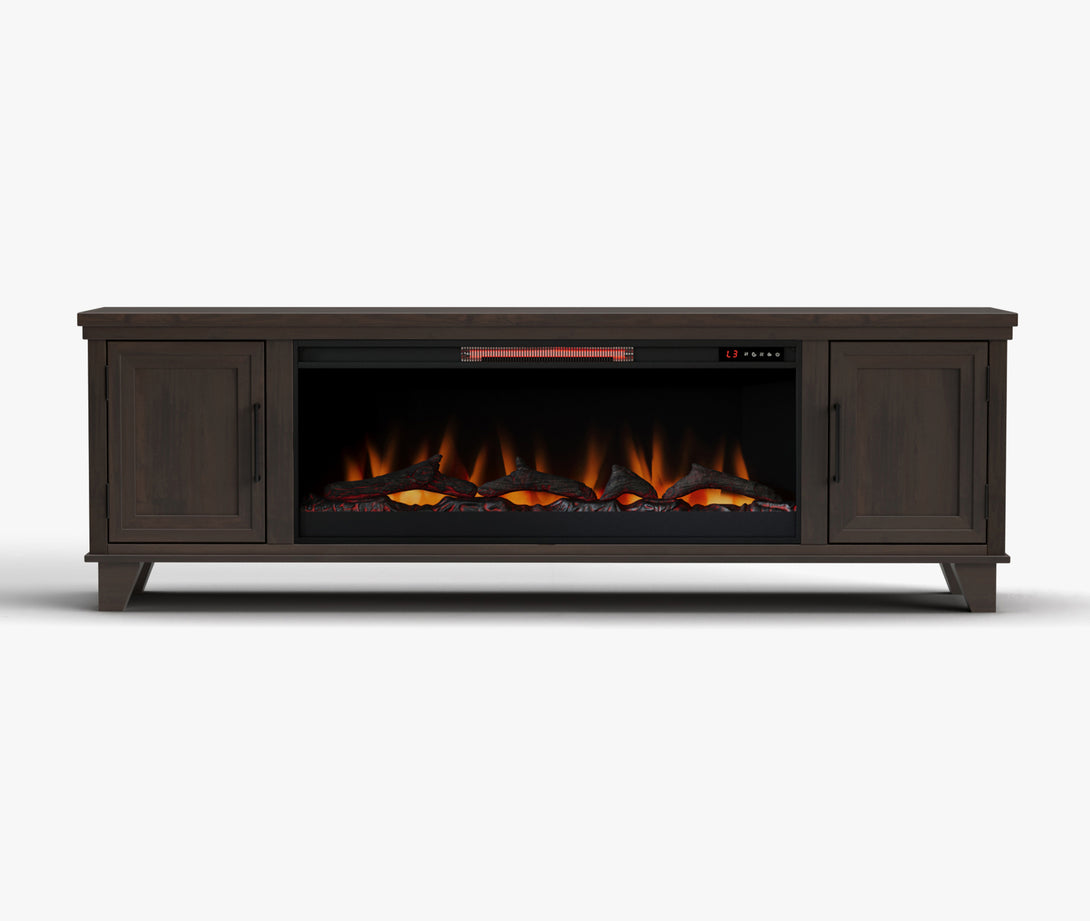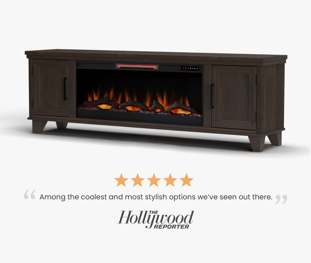 An electric fireplace add-on is available. Heating can be turned on to heat rooms up to 500 sq ft. Comes with customizable flame settings and variable speeds.