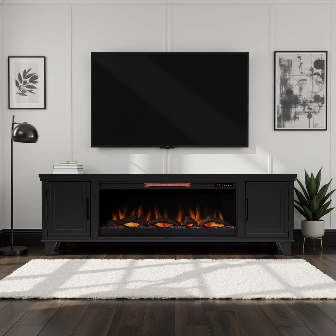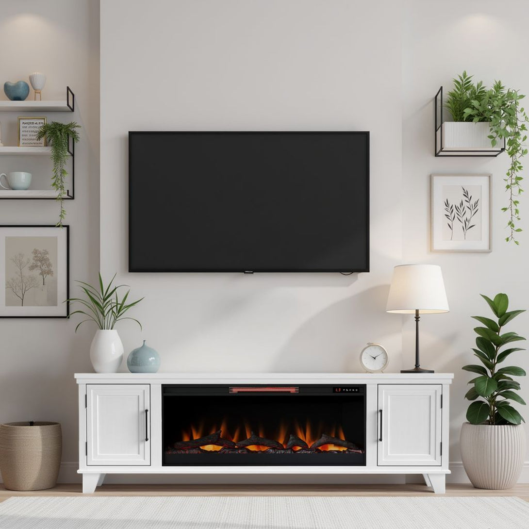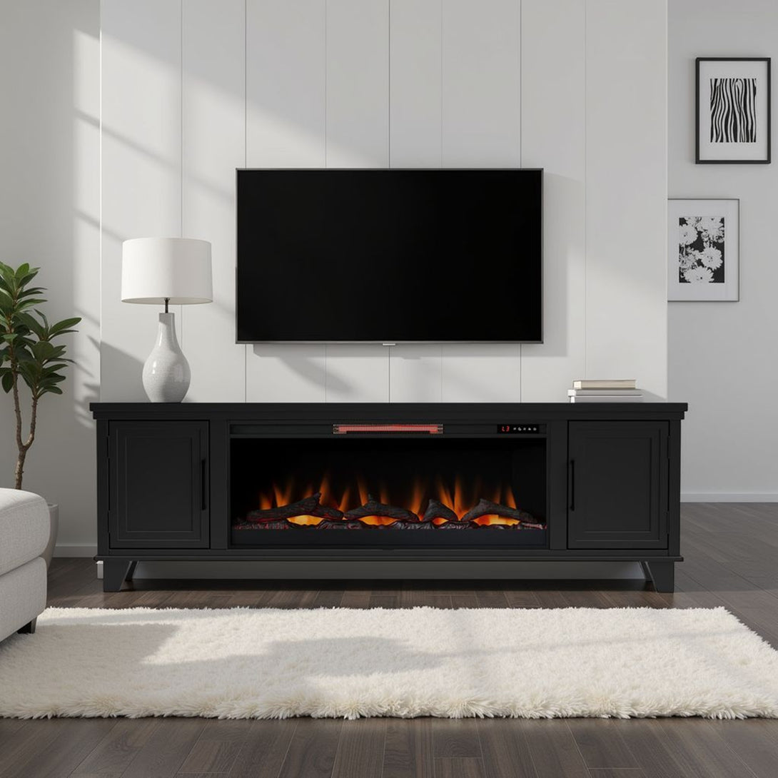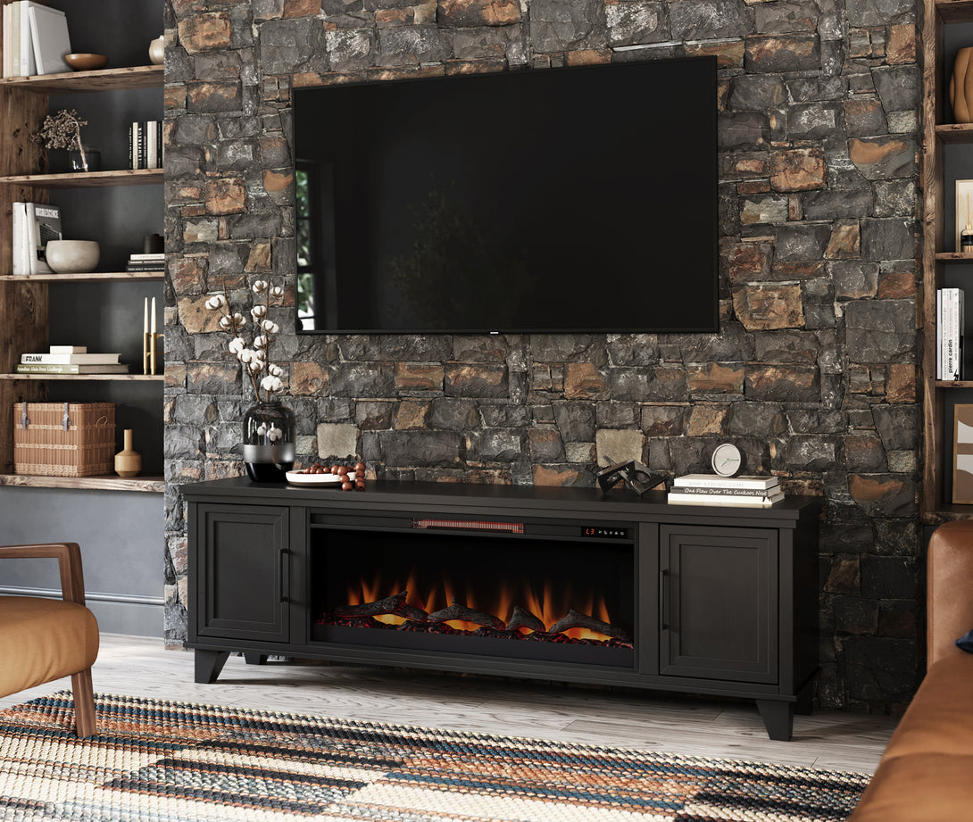 An electric fireplace add-on is available. Heating can be turned on to heat rooms up to 500 sq ft. Comes with customizable flame settings and variable speeds.