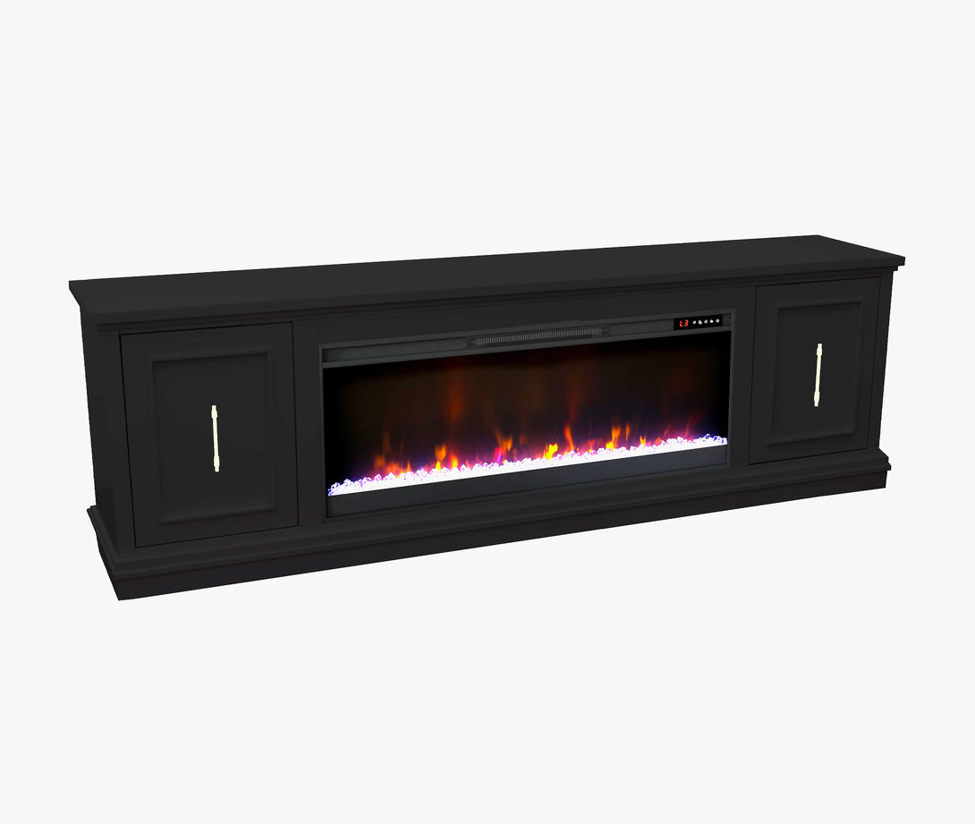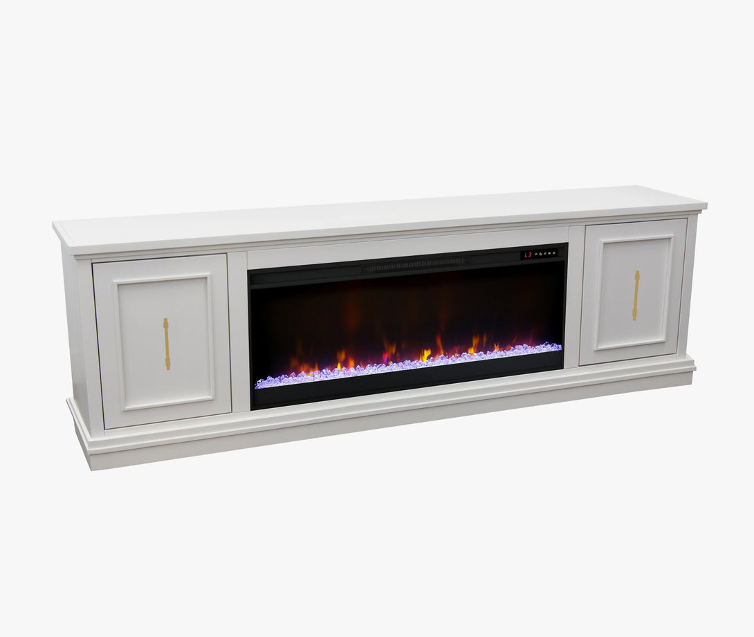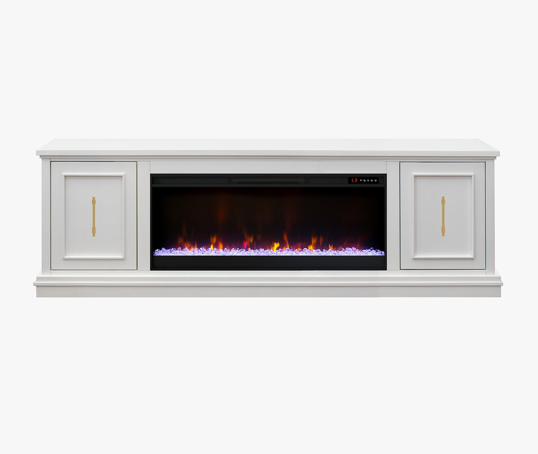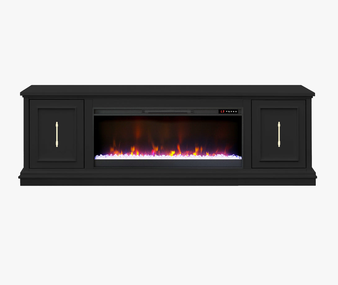 Look to the Jordan 82" Fireplace TV Stand for modern, refined style. The mitered framed panel doors, molding base and elongated gold hardware will provide a unique and sophisticated look for your home. Ideal for 90 inch TVs, the Jordan includes interior storage and cable management openings for media consoles and an electric fireplace insert with remote control.