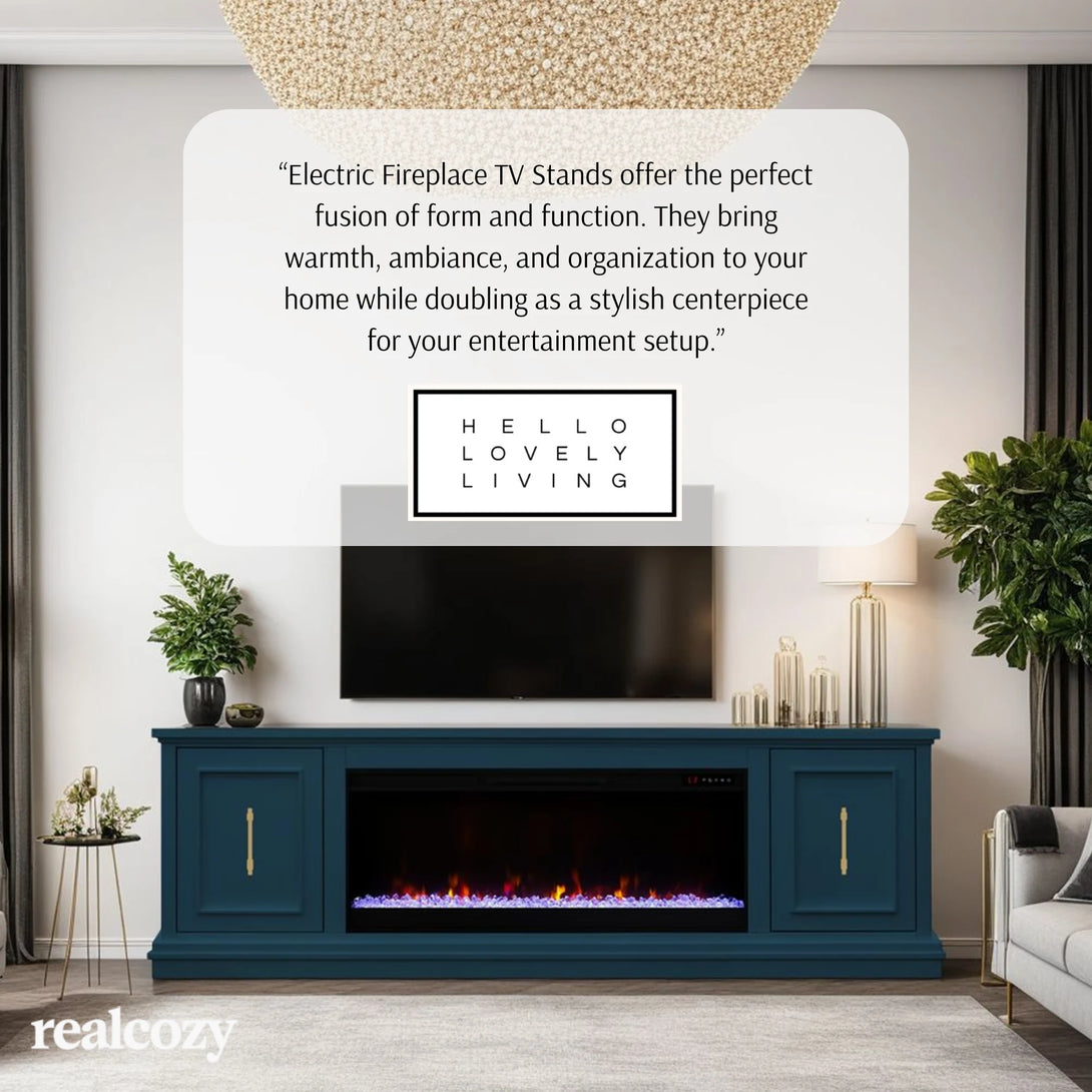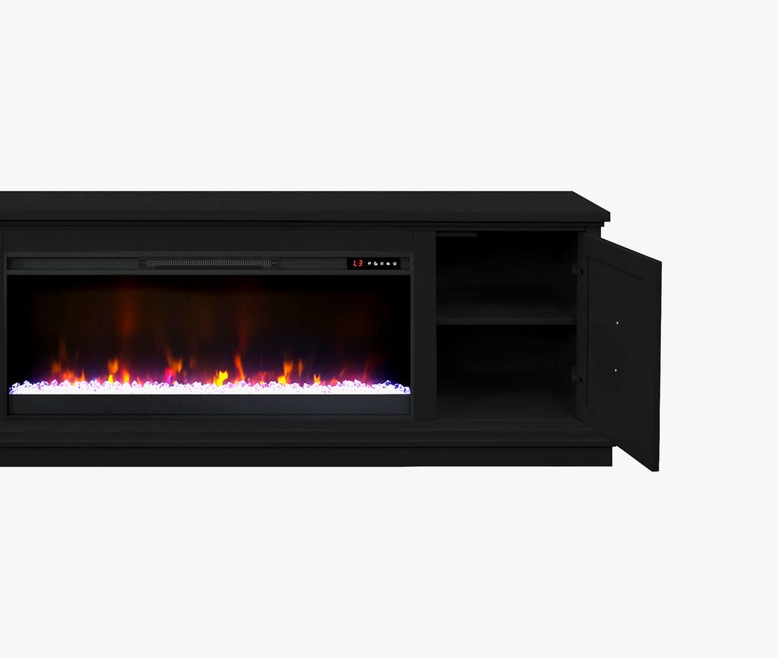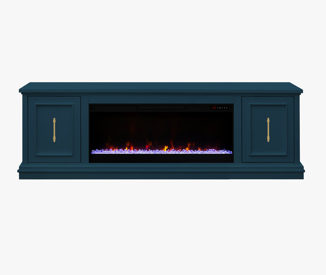 Look to the Jordan 82" Fireplace TV Stand for modern, refined style. The mitered framed panel doors, molding base and elongated gold hardware will provide a unique and sophisticated look for your home. Ideal for 90 inch TVs, the Jordan includes interior storage and cable management openings for media consoles and an electric fireplace insert with remote control.
