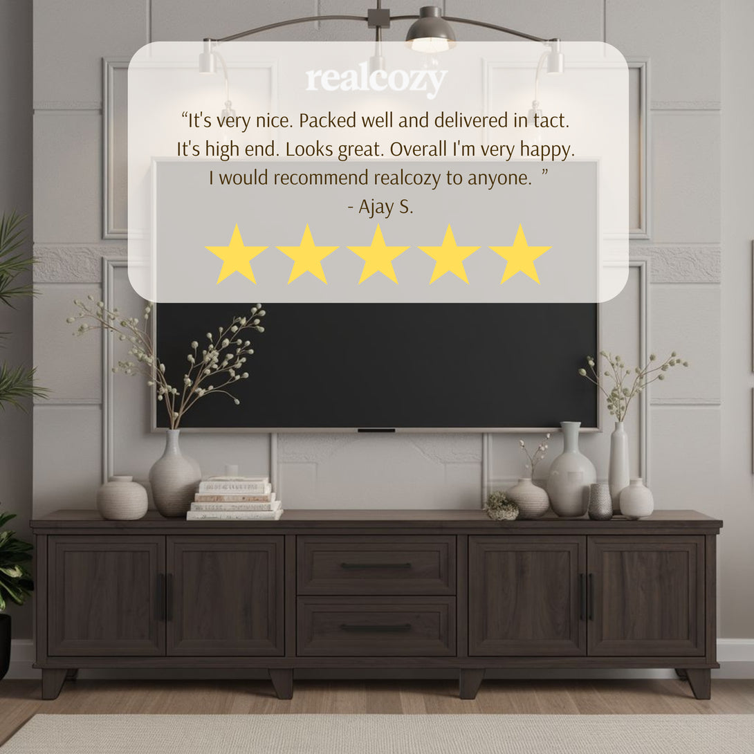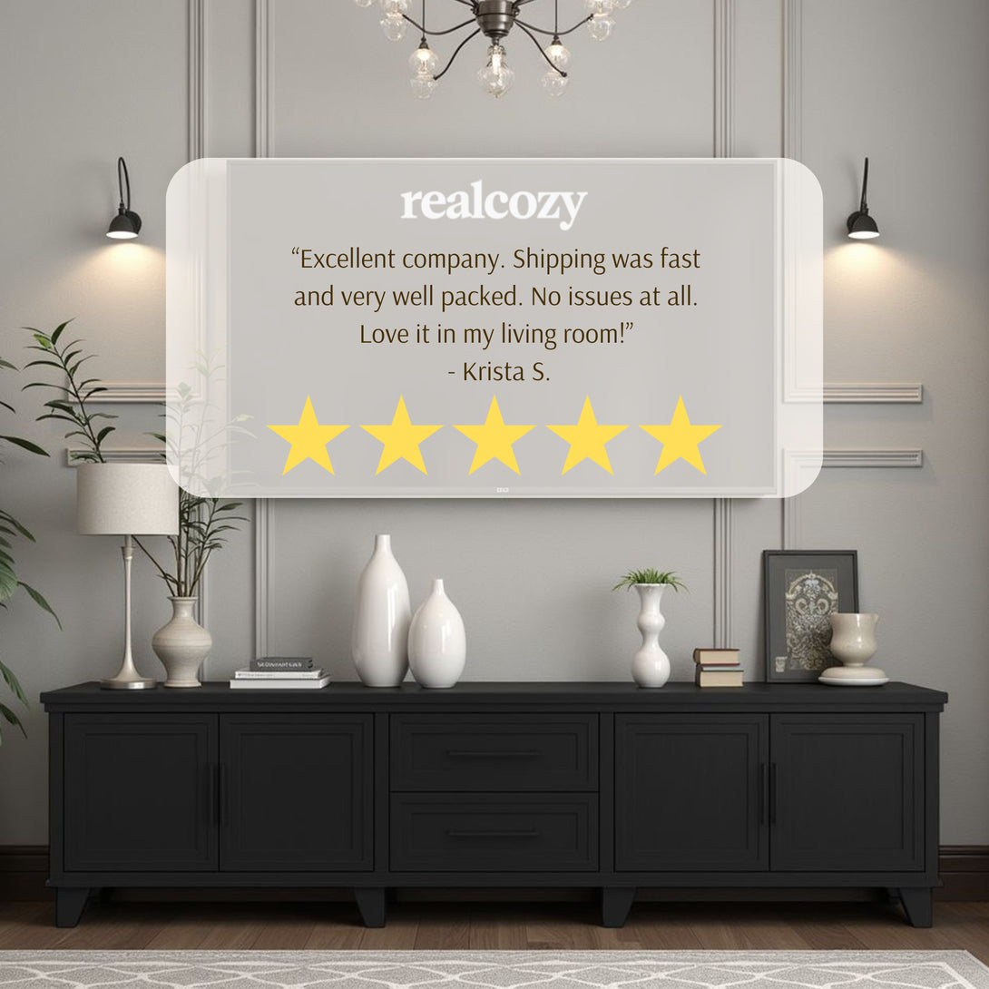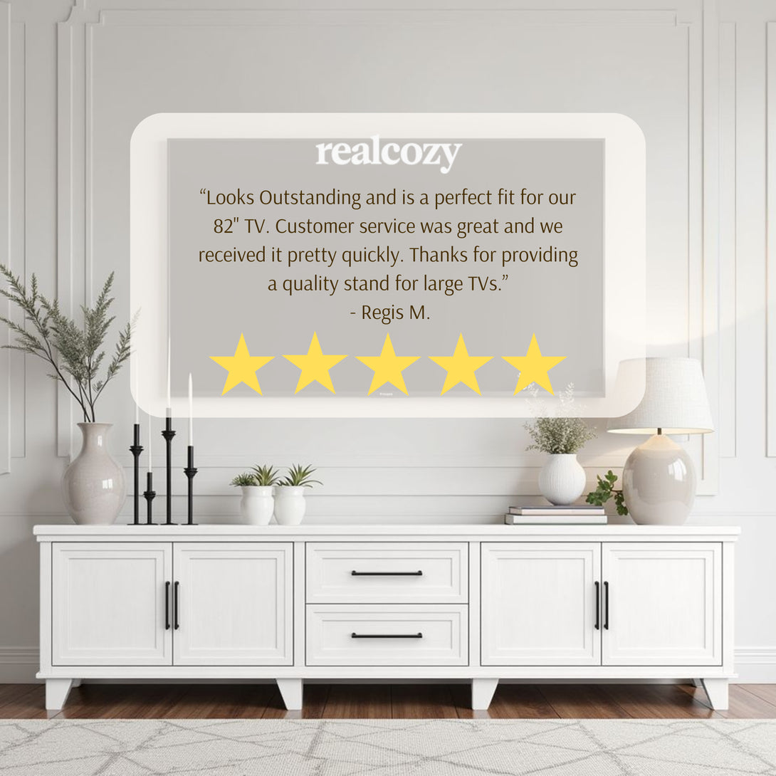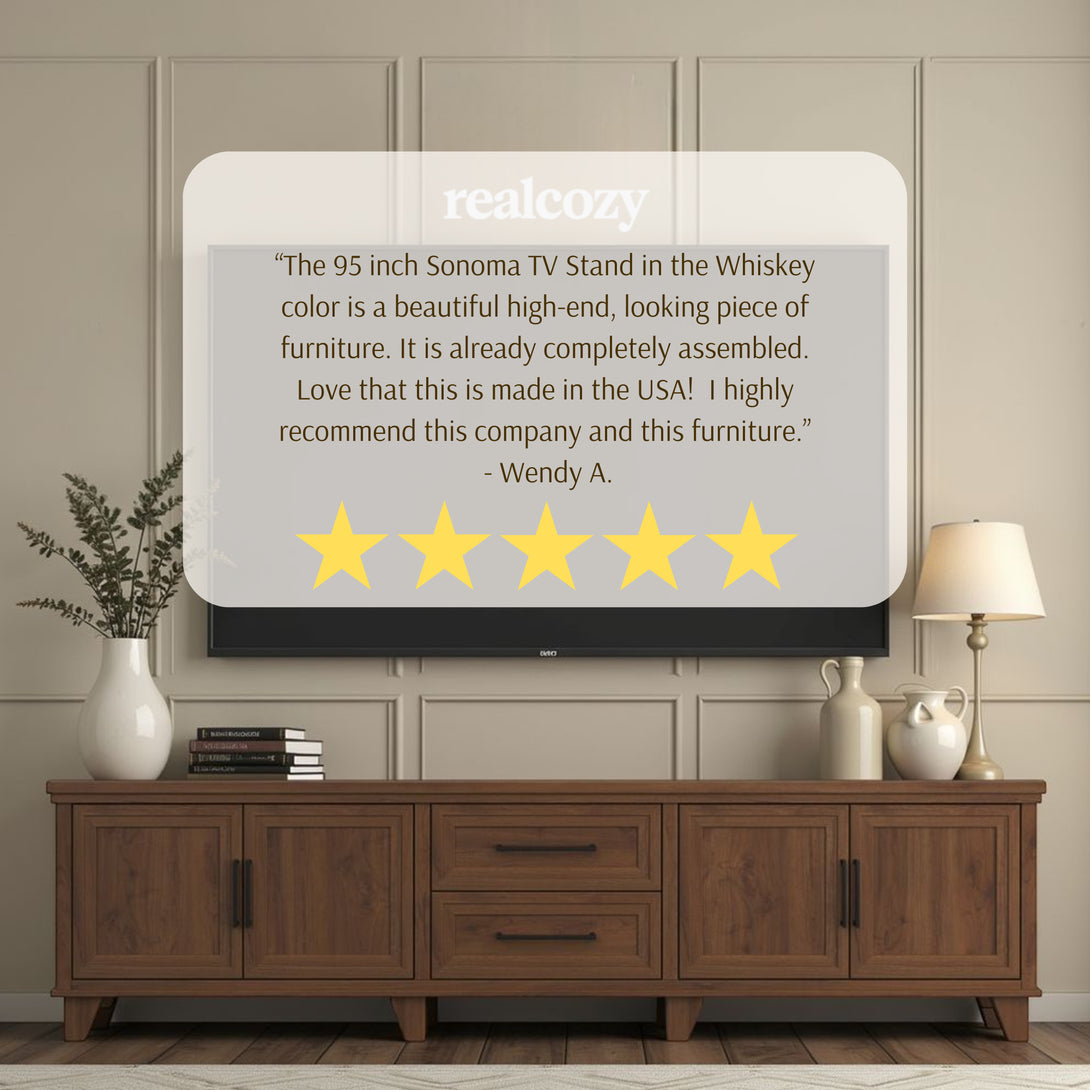 Crafted in the USA with real wood solids, veneers, and engineered wood for durability and timeless elegance. Realcozy TV stands bring the natural warmth and beauty of real wood grains to your home.